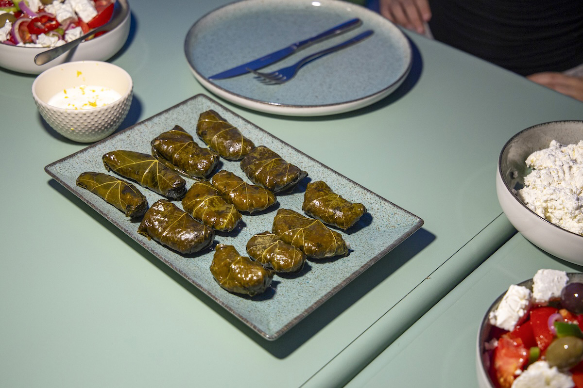 Delicate vine leaves stuffed with seasoned rice or Eggplant Rolls with Feta Cheese.